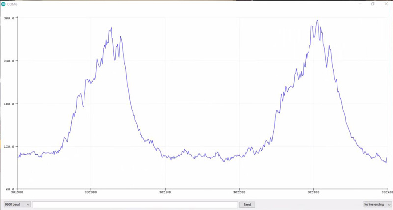 To observe muscle activity changes open the serial plotter and monitor the analog output while the muscle expands and contracts.